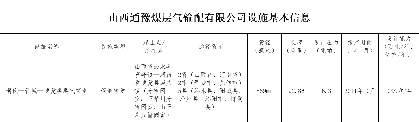 山西通豫煤层气输配有限公司设施基本信息