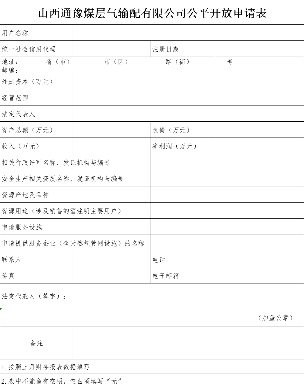 山西通豫煤层气输配有限公司公平开放申请表