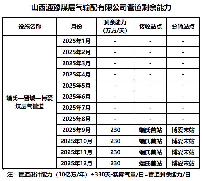 山西通豫煤层气输配有限公司管道剩余能力